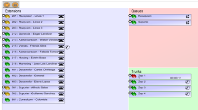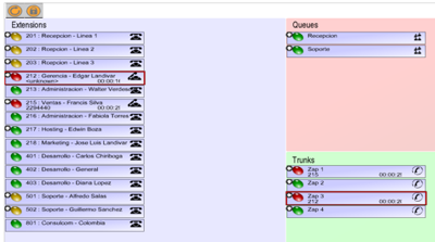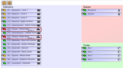 The Operator Panel displays the Extensions, Queues and Trunks sections to monitor the usage of phone lines, extensions and queues. Each one of these elements is shown in different colors, each with its own meaning: